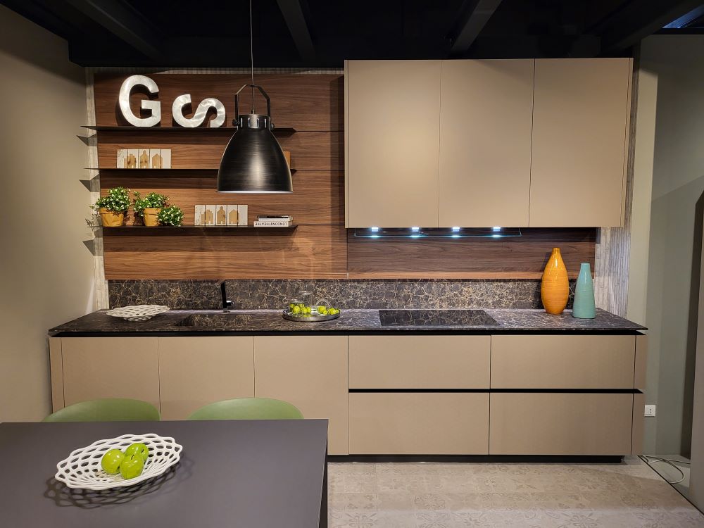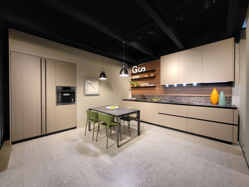 Le ante in PET color sabbia, impreziosite da una gola scaricata e da un profilo metallico a 90° rifinito in Moka Shine, conferiscono alla cucina un’eleganza senza tempo, con superfici lineari e pulite che esaltano la modernità del design. La finitura Moka Shine, con il suo effetto sofisticato, aggiunge profondità e raffinatezza, catturando la luce e creando un’atmosfera calda e accogliente. La scelta della gola scaricata, che elimina la necessità di maniglie tradizionali, permette di mantenere una continuità visiva impeccabile, valorizzando la pulizia estetica del progetto.