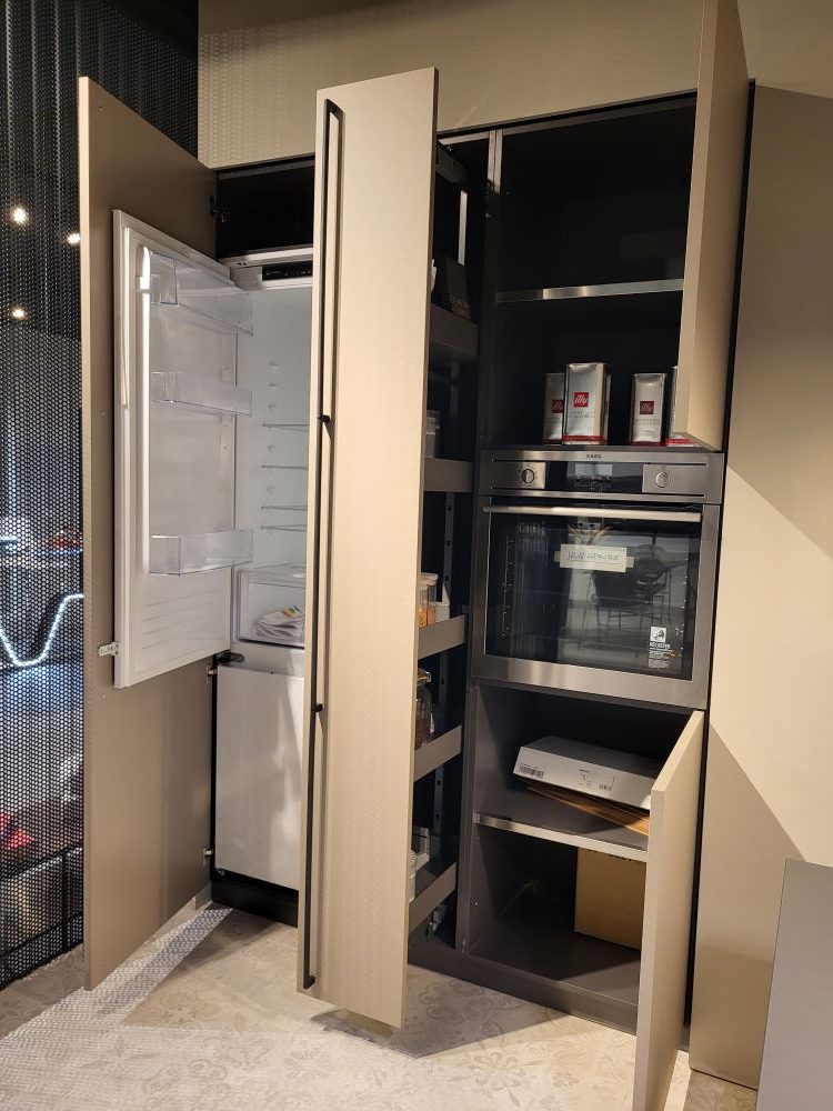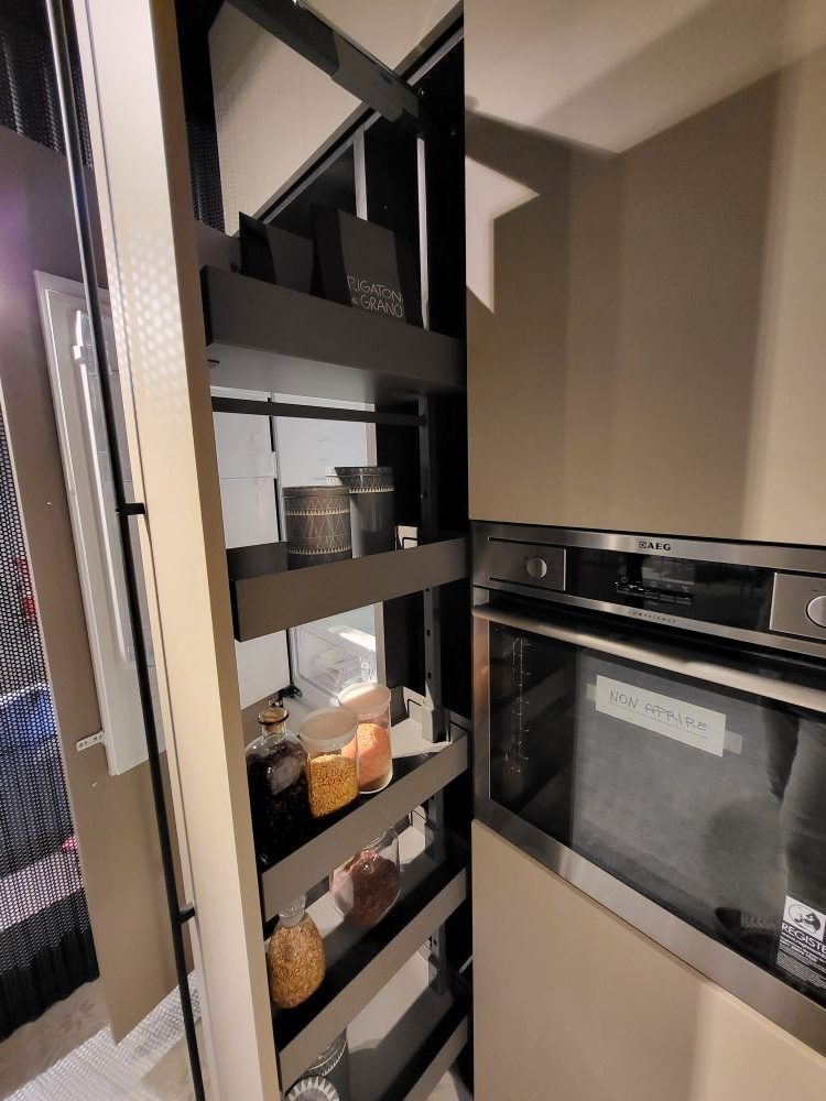Un’altra caratteristica distintiva di questa cucina è la colonna estraibile da 30 cm, una soluzione salvaspazio intelligente che permette di sfruttare al massimo ogni centimetro. Ideale per organizzare spezie, piccoli contenitori e utensili da cucina, la colonna estraibile garantisce un accesso rapido e una visibilità completa del contenuto, unendo praticità e stile.