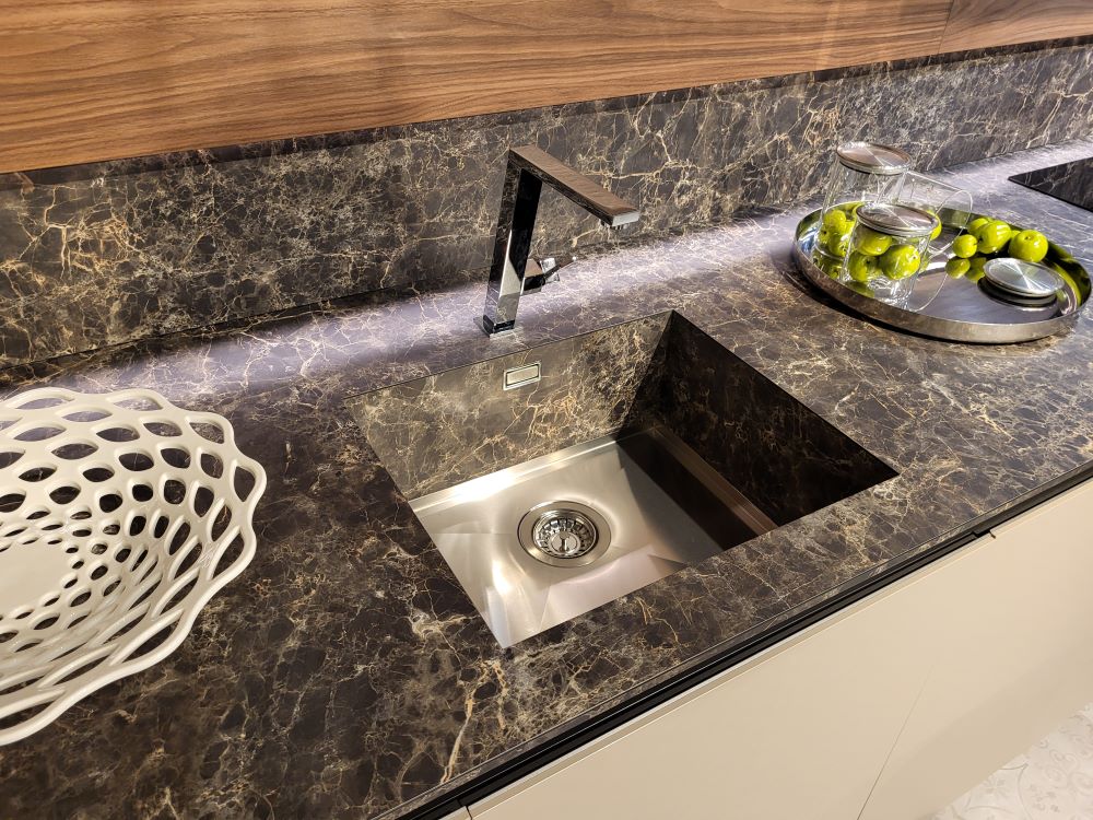 Il top in HPL Emperador, con la sua texture marmorea ricca di venature, è una scelta di grande impatto visivo, che dona alla cucina un tocco di lusso senza tempo. Oltre alla sua bellezza, questo materiale offre una resistenza eccezionale a graffi, calore e umidità, rendendolo perfetto per chi cerca una soluzione durevole e funzionale. Il lavello integrato nel piano di lavoro completa l’effetto di continuità visiva, eliminando interruzioni e garantendo una pulizia agevole.
